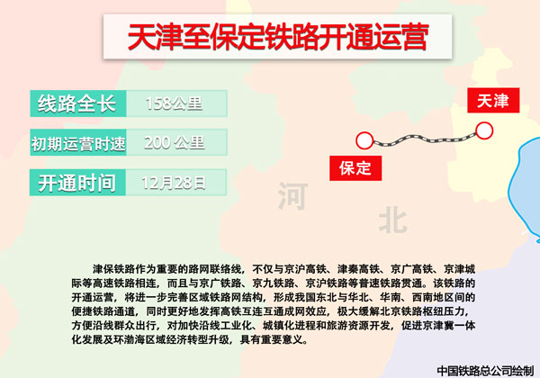 央廣網(wǎng)北京12月28日消息(記者郭淼)記者從中國(guó)鐵路總公司獲悉,12月28日,天津至保定鐵路開(kāi)通運(yùn)營(yíng),天津到保定的運(yùn)行時(shí)間將由原來(lái)的2小時(shí)36分壓縮至1小時(shí)左右,東北到華北、華南、西南地區(qū)間的運(yùn)行時(shí)間也將大幅度壓縮。