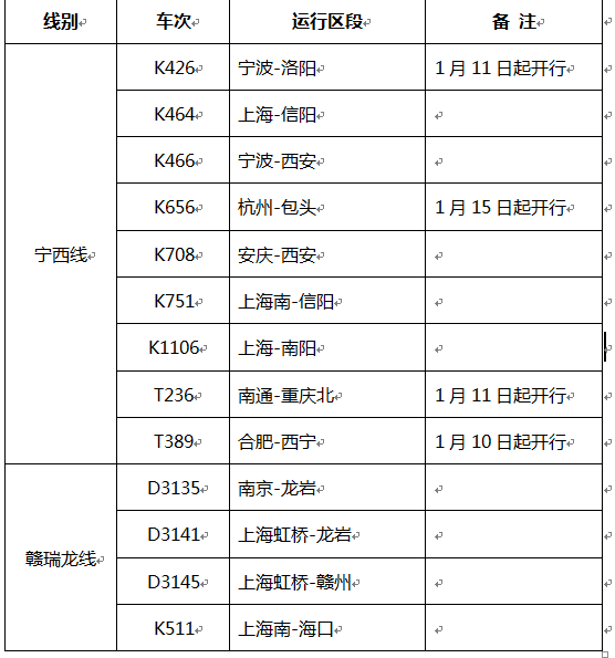二、根據(jù)寧西(南京—西安)線旅客列車新舊時刻交替方案、贛瑞龍(贛州—瑞金—龍巖)有關(guān)旅客列車調(diào)整開行及新舊交替方案等安排,自2016年1月2日8:00起,寧西線和贛瑞龍線相關(guān)旅客列車車票統(tǒng)一對外發(fā)售,有關(guān)車次見附件2。