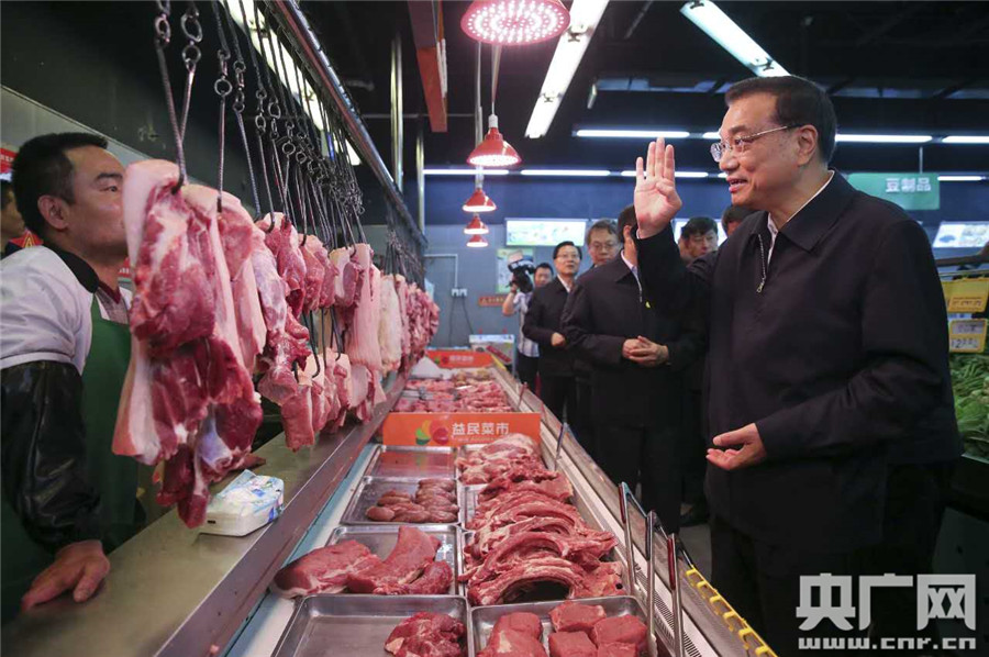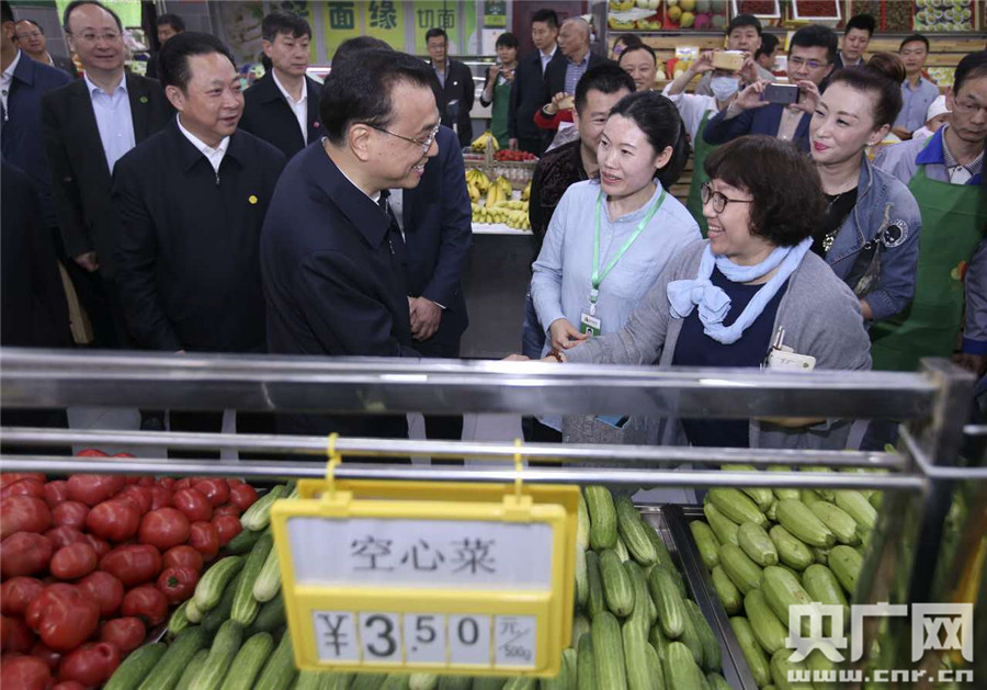 • 李克強25日一早到成都益民菜市   央廣網(wǎng)成都4月26日消息(記者馬喆)“你一個月掙多少錢?每天能吃上肉嗎?”李克強25日一早到成都益民菜市詢問一位買菜市民?偫硌財偽徊粫r停下細問店員各類蔬菜和豬肉價格變化,隨后對當?shù)刎撠熑颂岢鋈c要求:一要保障農(nóng)產(chǎn)品供應充足,二要保障食品安全,三要保障低保及低保邊緣困難群眾基本生活。