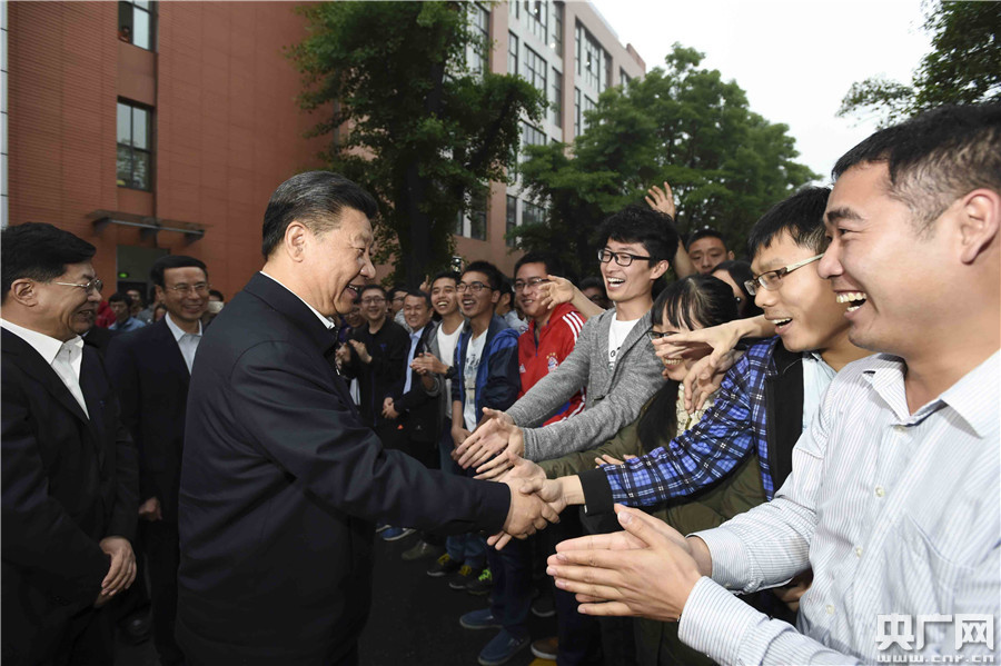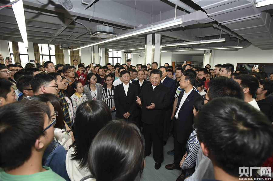 4月26日下午,習(xí)近平總書記來到中國科技大學(xué)圖書館自習(xí)室,同學(xué)生愉快交談。(新華社記者李濤 李學(xué)仁/攝) 央廣網(wǎng)合肥4月26日消息(記者劉樂)4月26日下午,習(xí)近平總書記來到中國科技大學(xué)圖書館自習(xí)室。見到總書記來了,學(xué)生們圍攏過來,爭著向總書記問好。“家是哪里的?一個(gè)人來合肥上大學(xué)爸媽放心嗎?”“國防班有多少人?招生時(shí)就定向了吧?”“去西部地區(qū)支教這一年感受很深吧?農(nóng)村的孩子,不忘初衷!薄霸趫D書館學(xué)習(xí)覺得氛圍很好吧?還得早點(diǎn)來占個(gè)座?”總書記同身邊的學(xué)生愉快交談著。大家你一言我一語回答總書記提出的問題,談自己的大學(xué)生活,講人生的目標(biāo)理想。 聽了同學(xué)們的話,總書記說,過去中國人口多、人手多,現(xiàn)在正轉(zhuǎn)變成人才多。建設(shè)制造業(yè)強(qiáng)國、實(shí)現(xiàn)“兩個(gè)一百年”奮斗目標(biāo),教育是基礎(chǔ)。我們對中國建設(shè)國際一流大學(xué)、培養(yǎng)國際一流人才充滿自信。我們的胸襟是開放的,包容并蓄。幸福不是從天降,中國人民取得的成就是很了不起的,不要妄自菲薄,同時(shí)要自強(qiáng)不息。年青人在學(xué)校要心無旁騖,學(xué)成文武藝,報(bào)效祖國和人民,報(bào)效中華民族。同學(xué)們好好學(xué)吧!