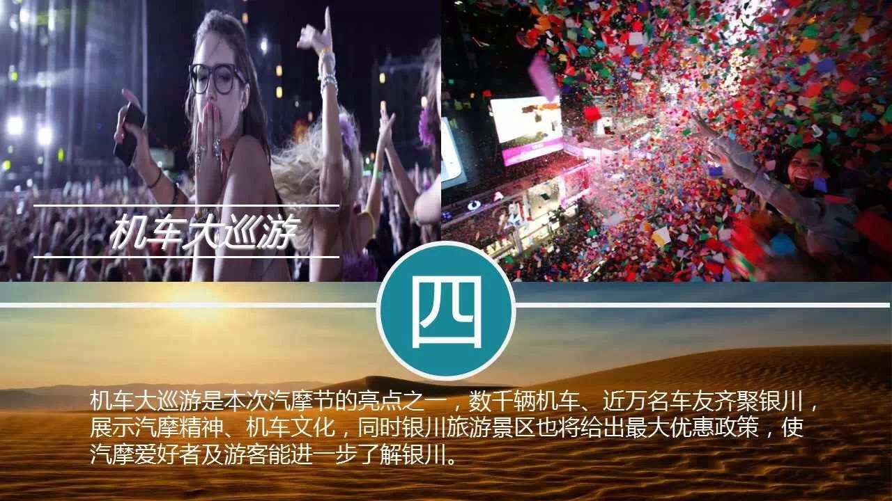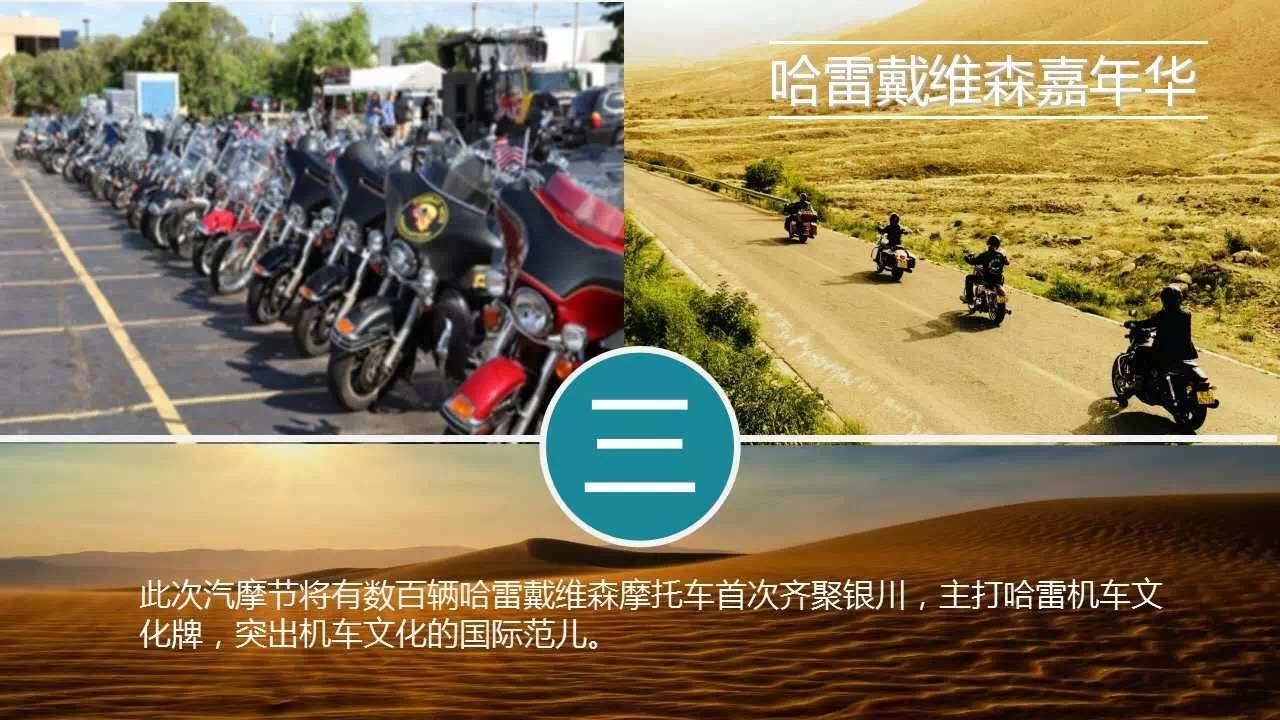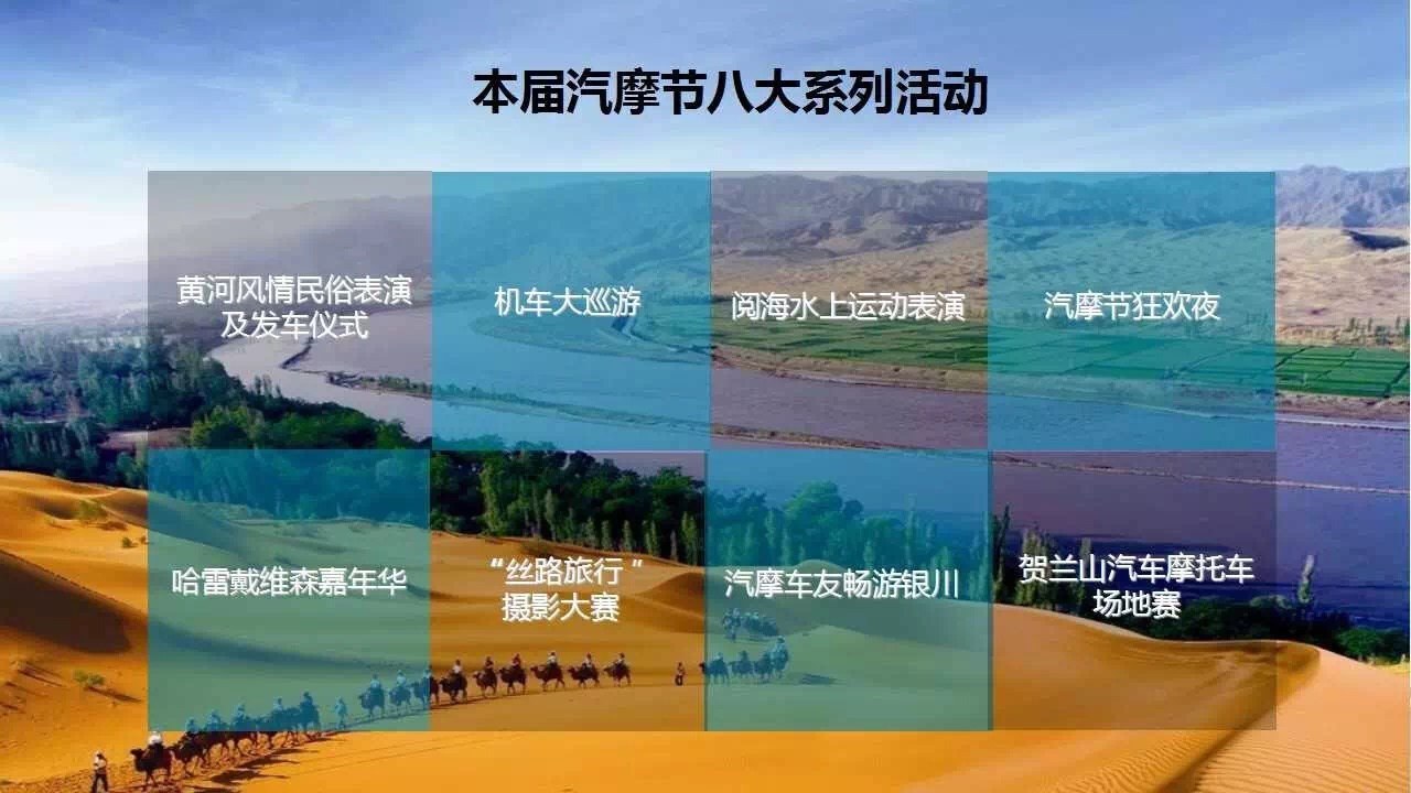 2016年8月7日至9日,首屆中國(guó)·寧夏(銀川)絲綢之路國(guó)際汽車摩托車自駕旅游節(jié)暨哈雷戴維森中國(guó)第八屆全國(guó)車主騎行活動(dòng)將在寧夏回族自治區(qū)首府銀川市舉辦。據(jù)介紹,本屆汽摩節(jié)將舉辦“絲路旅行從銀川啟航”攝影大賽、黃河風(fēng)情民俗展演、賀蘭山汽車摩托車場(chǎng)地賽、機(jī)車大巡游、水上運(yùn)動(dòng)表演、汽摩節(jié)狂歡夜、哈雷戴維森嘉年華、汽摩車友暢游銀川等八大系列活動(dòng),突出四大亮點(diǎn):