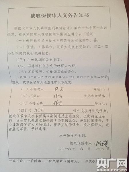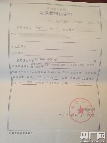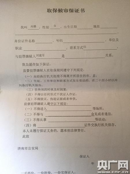 此時(shí)的劉建軍,還處于取保候?qū)徶校皇侨”:驅(qū)彽氖掷m(xù)還沒有辦完。羅先生向記者提供了三張他從濟(jì)南警方那里帶回來的法律文書,一張是濟(jì)南市公安局對(duì)劉建軍的取保候?qū)彌Q定書原件,蓋有濟(jì)南市公安局的公章;一張簽有劉建軍名字的被取保候?qū)徣烁嬷獣;還有一張是打印有劉璐名字和性別的取保候?qū)彵WC書,其他應(yīng)填信息均為空白。