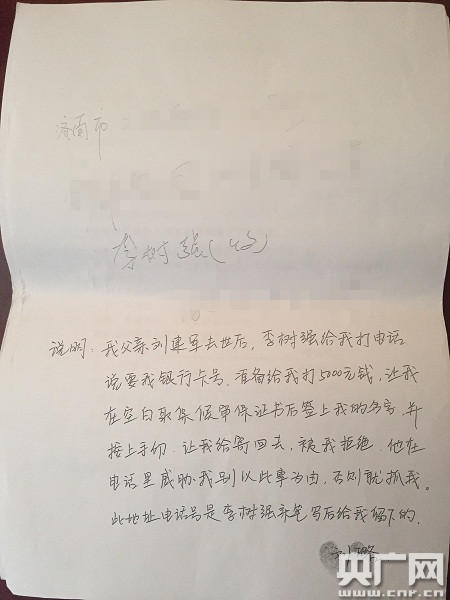 劉建軍的女兒劉璐說,父親去世后,她曾兩次接到辦案民警李樹強(qiáng)的電話,要求將取保候?qū)徥掷m(xù)寄回,但被她拒絕。在她看來,這份沒有辦完的取保候?qū)徥掷m(xù)上,寫有父親生前的最后手跡。