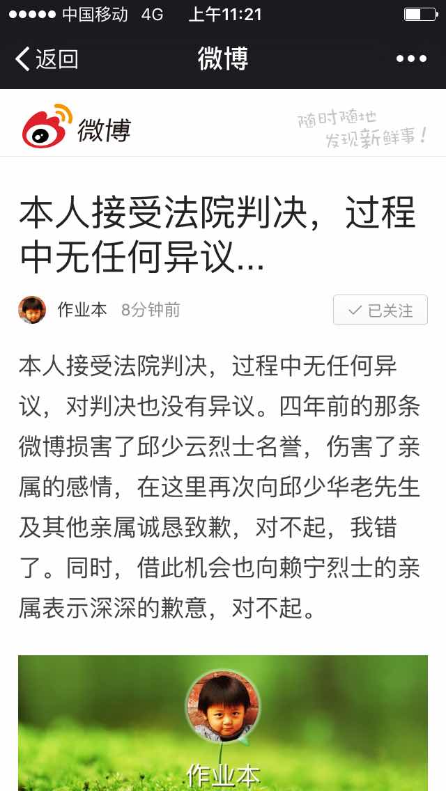 隨后,孫杰通過微博表示接受判決,并向邱少華致歉。