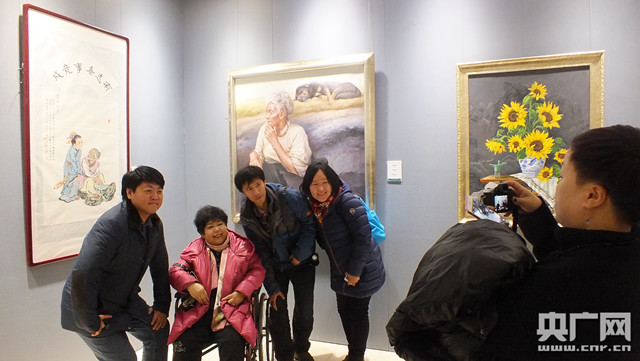 書畫作者(圖中坐輪椅者)在自己的作品前準備向參觀者做展示介紹