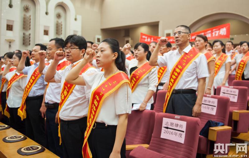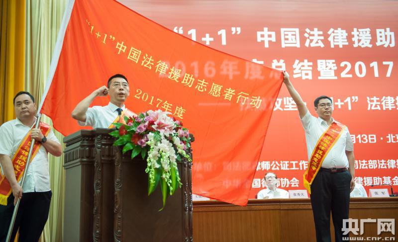 央廣網(wǎng)北京7月13日消息(記者孫瑩)據(jù)中國之聲《央廣新聞》報道,2017年度“1+1”中國法律援助志愿者行動啟動儀式在北京人民大會堂舉行,242名律師和大學生志愿者從司法部部長、黨組書記張軍手中接過了“1+1”中國法律援助志愿者行動旗幟,并莊嚴宣誓,他們將奔赴青海、西藏、新疆、貴州等14個。▍^(qū)、市)和新疆生產(chǎn)建設兵團的170多個縣(區(qū)),開展為期一年的法律援助志愿服務,扶貧攻堅。