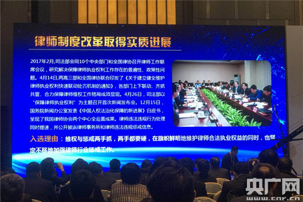 2017年2月,司法部會(huì)同10個(gè)中央部門和全國律協(xié)召開律師工作聯(lián)席會(huì)議,研究解決保障律師執(zhí)業(yè)權(quán)利工作存在的普遍性、政策性問題。4月14日,兩高三部和全國律協(xié)聯(lián)合印發(fā)了《關(guān)于建立健全維護(hù)律師執(zhí)業(yè)權(quán)利快速聯(lián)動(dòng)處置機(jī)制的通知》,各部門上下聯(lián)動(dòng)、齊抓共管、合力保障律師維權(quán)工作格局成效顯現(xiàn)。4月26日,司法部以“保障律師執(zhí)業(yè)權(quán)利”為主題召開首次新聞發(fā)布會(huì)。12月15日,國務(wù)院新聞辦公室發(fā)表《中國人權(quán)法治化保障的新進(jìn)展》白皮書,呈現(xiàn)了我國律師協(xié)會(huì)兩個(gè)中心全覆蓋成果。律師違法違規(guī)行為處理同時(shí)提速,并公開披露律師事務(wù)所和律師違法違規(guī)懲戒信息。