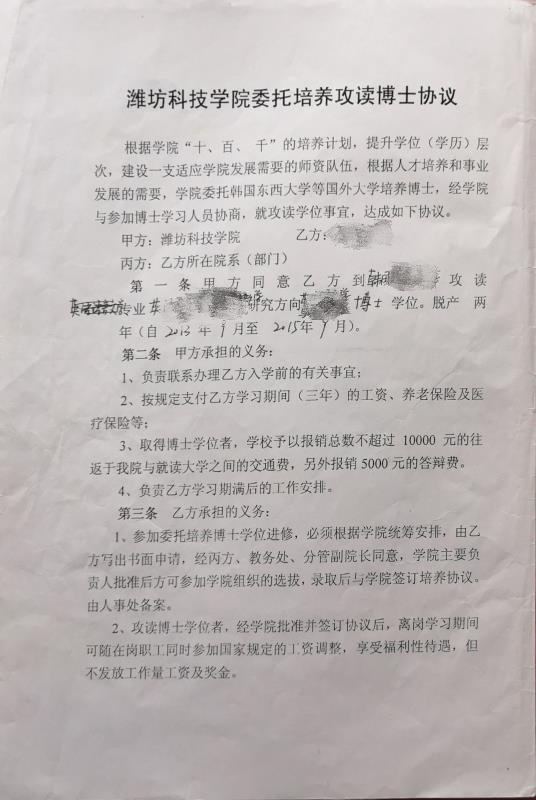 三位老師中,張老師最早獲得博士學(xué)位,2018年8月她于韓國某高校畢業(yè),當(dāng)年7月,向此前工作的山東濰坊科技學(xué)院提出辭職:“2013年的時候?qū)W校鼓勵出去讀博士,因為之前有計算機(jī)系的老師們也出去了,就是去韓國,我們外語系的幾個也想去,然后這些所有的讀博手續(xù)都是我們自己辦理的。”張老師說。