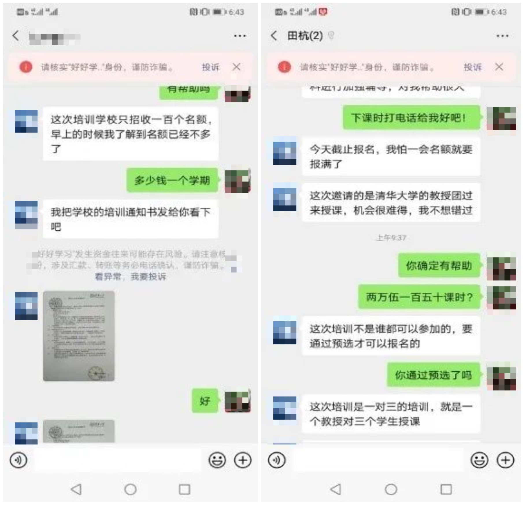 同樣是在上個月,安徽合肥的張女士一天在上班時收到了一條自稱是自己孩子的QQ信息,由于工作忙,張女士同樣沒想太多。在添加QQ好友后,對方稱當(dāng)?shù)亟逃盅埖角迦A大學(xué)資深教授到學(xué)校培訓(xùn),自己通過篩選得到了寶貴的培訓(xùn)名額,急需交一筆4萬元的報名費。張女士說:“他當(dāng)時說,‘媽,我是誰誰誰,’我就以為他是我家的孩子。然后因為錢有點多,我一直沒想著報,但是今天下午3點就截止了!