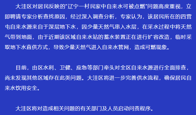 對此,盤錦市有關部門公布了初步調(diào)查結果,四營屯當?shù)刈詠硭磥碜杂谏顚拥叵滤,與天然氣層有交叉的地方,水井在采水過程中將天然氣帶到了地面。