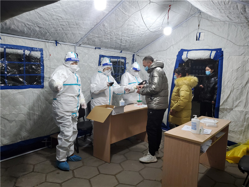 近一周來,北京降溫明顯,給每天穿著防護(hù)服在室外工作的工作人員帶來了更大的考驗(yàn)。謝雪飛說,印象最深的是去年12月29日晚上!白龊怂釞z測之前那一天,也就是29日籌備那天,風(fēng)特別大、天氣特別冷,我們穿著防護(hù)服搭帳篷、干活。那么大的風(fēng),帳篷都差點(diǎn)刮跑了,雖然戴了手套,但是手都凍木了,我們還在那兒扶著帳篷,前后堅持了兩個多小時,帳篷才弄好。雖然我們也有施工的,但是考慮到施工師傅的安全,就沒讓施工師傅進(jìn)村!