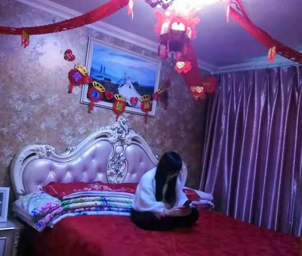 新婚之夜范慧嫻在布置一新的婚房里翻看著兩人的婚紗照(受訪(fǎng)者供圖)