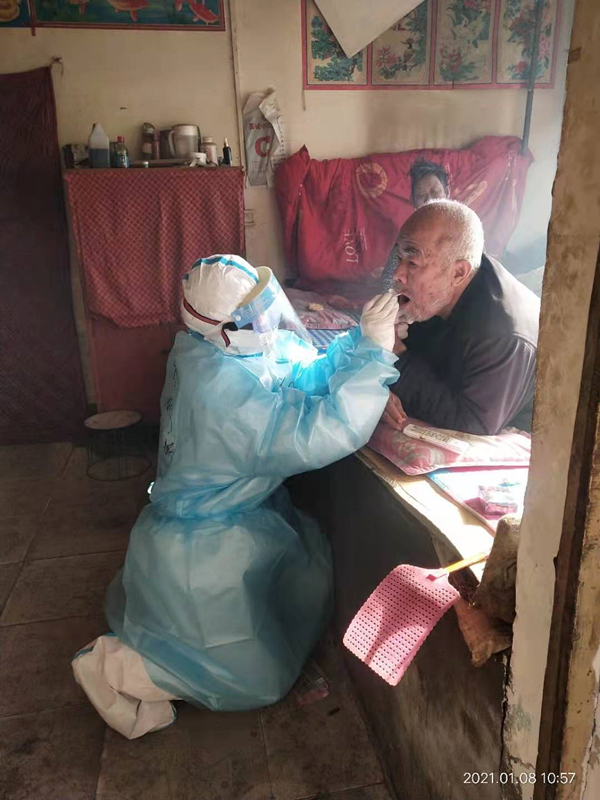 藁城區(qū)是高風險地區(qū),對于重點人群、區(qū)域要進行多次核酸檢測。郭嬌嬌說,她平均每天要給三四百人做核酸采集工作,印象最深的是一位老人。入戶到老人家里,當時老人躺在床上,為了更清楚地看到采集部位,保證標本采集質量,郭嬌嬌跪在地上,用手托住老人的下頜。她說:“當時入戶采集的時候,這一家這個老爺爺可能家里邊沒有孩子,只有老爺爺跟老奶奶在家,門口也沒有門,只有玉米穗堆成的墻頭。進去之后,老奶奶就在床上坐著,老爺爺在床上趴著,因為他一動就會喘,我就說你不用動,我就直接蹲下給他采集的,完了之后老爺爺還說你們太辛苦了,坐會吧!