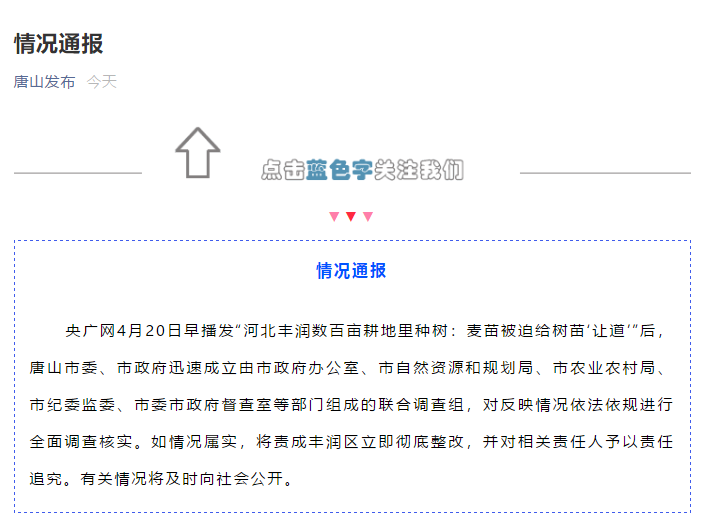 央廣網(wǎng)唐山4月20日消息(總臺(tái)央廣記者管昕) 據(jù)唐山發(fā)布消息,央廣網(wǎng)4月20日早播發(fā)“河北豐潤(rùn)數(shù)百畝耕地里種樹:麥苗被迫給樹苗‘讓道’”后,唐山市委、市政府迅速成立由市政府辦公室、市自然資源和規(guī)劃局、市農(nóng)業(yè)農(nóng)村局、市紀(jì)委監(jiān)委、市委市政府督查室等部門組成的聯(lián)合調(diào)查組,對(duì)反映情況依法依規(guī)進(jìn)行全面調(diào)查核實(shí)。如情況屬實(shí),將責(zé)成豐潤(rùn)區(qū)立即徹底整改,并對(duì)相關(guān)責(zé)任人予以責(zé)任追究。有關(guān)情況將及時(shí)向社會(huì)公開。