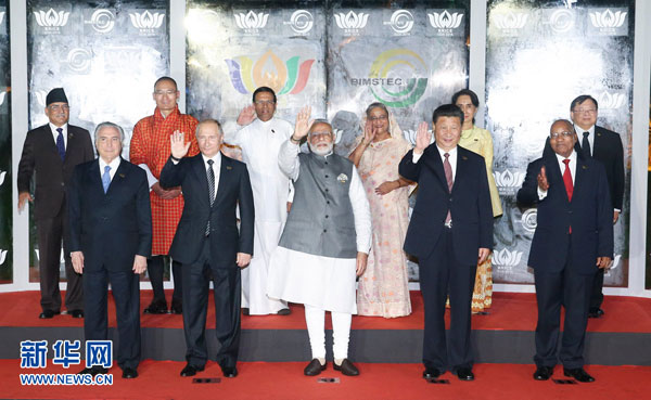 10月16日,金磚國家領(lǐng)導(dǎo)人同“環(huán)孟加拉灣多領(lǐng)域經(jīng)濟(jì)技術(shù)合作倡議”成員國領(lǐng)導(dǎo)人對話會(huì)在印度果阿舉行。國家主席習(xí)近平同印度總理莫迪、南非總統(tǒng)祖馬、巴西總統(tǒng)特梅爾、俄羅斯總統(tǒng)普京以及斯里蘭卡總統(tǒng)西里塞納、孟加拉國總理哈西娜、不丹首相托杰、尼泊爾總理普拉昌達(dá)、緬甸國務(wù)資政昂山素季、泰國政府代表等共同出席。這是與會(huì)領(lǐng)導(dǎo)人合影。新華社記者姚大偉攝