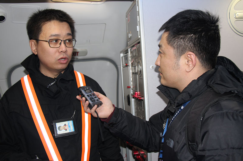 大連機(jī)場(chǎng)機(jī)務(wù)工程部波音維修分部副經(jīng)理王兆勛(左)接受央廣記者賈鐵生采訪