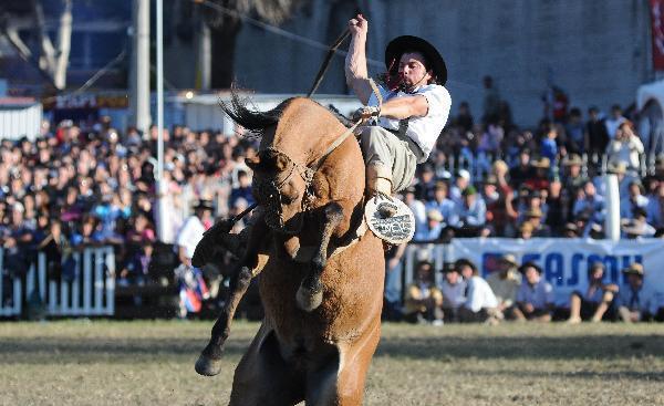 烏拉圭蒙得維的亞日前舉行了“克里奧爾周”馴馬比賽。眾多騎手與野馬拼斗,不時上演“人仰馬翻”的情況,可謂驚險刺激。
