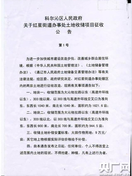 村民們說,他們的口糧田在兩年多前被莫名“征收”,總面積約2500畝,區(qū)政府文件中明明規(guī)定每畝地的補(bǔ)償是9萬元,但最終拿到手的卻只有每畝5萬4千元,而從始至終科爾沁區(qū)有關(guān)部門也沒有向他們出示過征地批準(zhǔn)文件。
