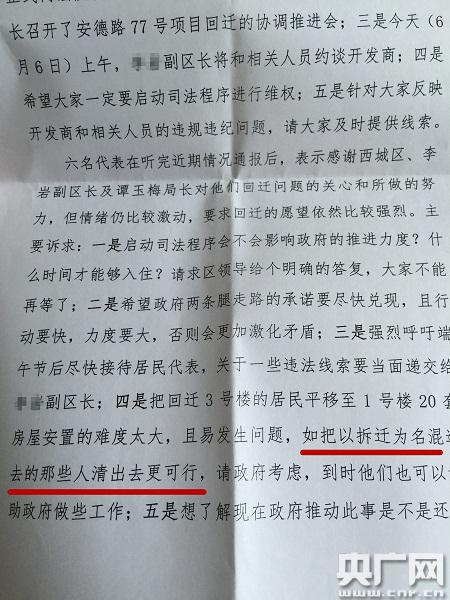 6月6號,西城區(qū)房管局應(yīng)急與信訪科給上級單位的一份接待77號院居民代表的情況中寫道:“把回遷3號樓的居民平移至1號樓20套房屋安置的難度太大,且易發(fā)生問題,如把以拆遷為名混進(jìn)去的那些人請出去更可行,請政府考慮”,并建議回遷戶啟動司法程序維權(quán)。