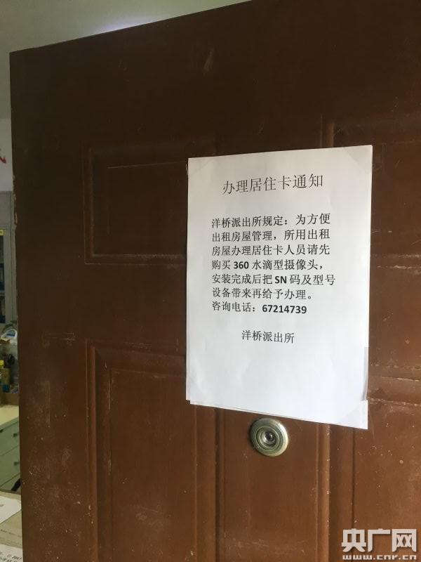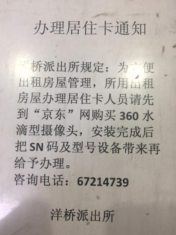 薛女士提供的現(xiàn)場照片上,可以看到一份名為“辦理居住卡通知”。其中這樣表述:洋橋派出所規(guī)定,為方便出租房屋管理,所用(有)出租房屋辦理居住卡人員請先到京東網(wǎng)購360水滴型攝像頭,安裝完成后,把SN碼及型號設備帶來,再給予辦理。后面所附的咨詢電話,正是洋橋派出所的辦公電話。