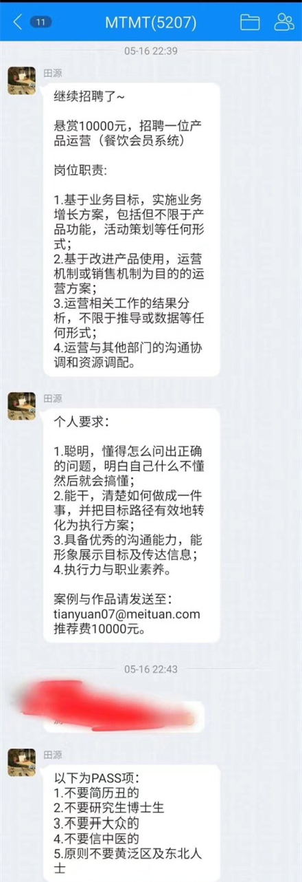 從微博爆料出來的截圖上看,這則招聘信息是發(fā)布在標注為“MTMT”的qq群里。發(fā)布人在群里的名字叫田源,信息上稱“懸賞一萬,招聘一位產(chǎn)品運營”,崗位職責是“基于業(yè)務目標,實施業(yè)務增長方案”等,發(fā)布者的個人要求是,“聰明,能干,具有執(zhí)行力與職業(yè)素養(yǎng)”等。在這兩條信息后,發(fā)布者還發(fā)布了5條限制,說“不要簡歷丑的,不要研究生博士生,不要開大眾的,不要信中醫(yī)的,原則不要黃泛區(qū)及東北人士”。