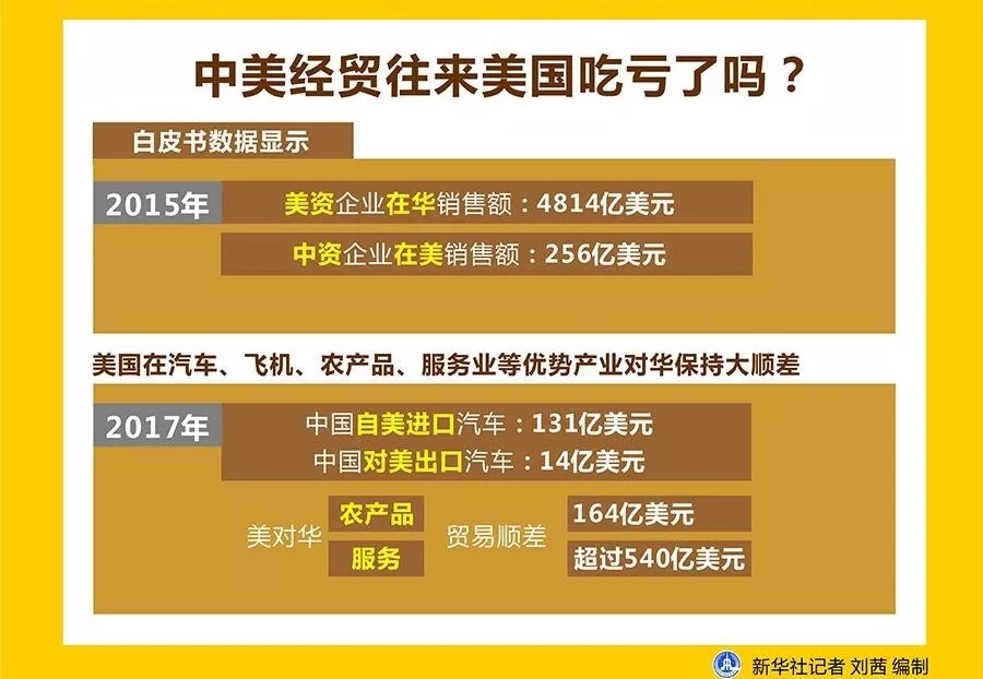 相關(guān)的數(shù)據(jù)也顯示,美國在多領(lǐng)域?qū)θA保持大順差。傅自應(yīng)指出:“美國在汽車、飛機(jī)、農(nóng)產(chǎn)品、服務(wù)業(yè)等優(yōu)勢(shì)產(chǎn)業(yè)都對(duì)華保持大順差。2017年中國自美進(jìn)口汽車131億美元,對(duì)美出口汽車14億美元。美對(duì)華農(nóng)產(chǎn)品貿(mào)易順差達(dá)到164億美元。美對(duì)華服務(wù)貿(mào)易順差超過540億美元。”