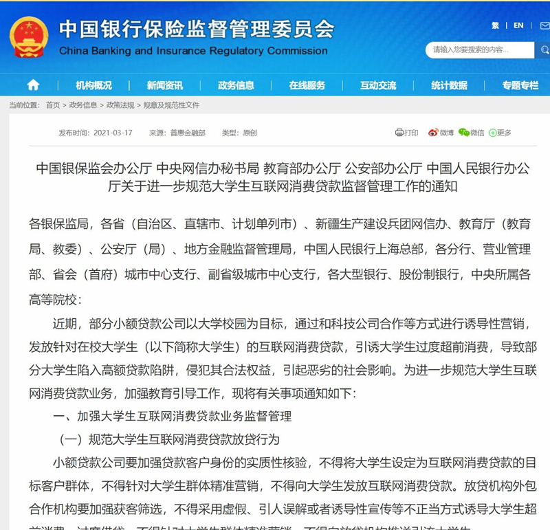 央廣網(wǎng)北京3月18日消息 據(jù)中央廣播電視總臺中國之聲《新聞?dòng)杏^點(diǎn)》報(bào)道,3月17日,銀保監(jiān)會、中央網(wǎng)信辦、教育部、公安部、中國人民銀行五部門聯(lián)合印發(fā)《關(guān)于進(jìn)一步規(guī)范大學(xué)生互聯(lián)網(wǎng)消費(fèi)貸款監(jiān)督管理工作的通知》(以下簡稱《通知》),明確小額貸款公司不得向大學(xué)生發(fā)放消費(fèi)貸款,花唄、借唄不能向大學(xué)生放款了?