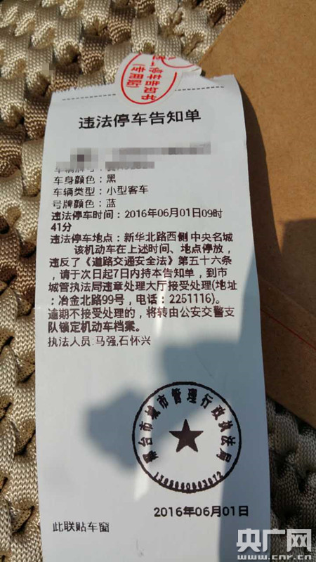冀先生6月1日收到的違法停車告知單上,告知他違反了《道路交通安全法》第五十六條,他必須在7天內(nèi)拿著告知單,到當(dāng)?shù)爻枪軋?zhí)法局違章處理大廳接受處理,逾期不接受處理,將轉(zhuǎn)由公安交警支隊(duì)鎖定機(jī)動車檔案。
