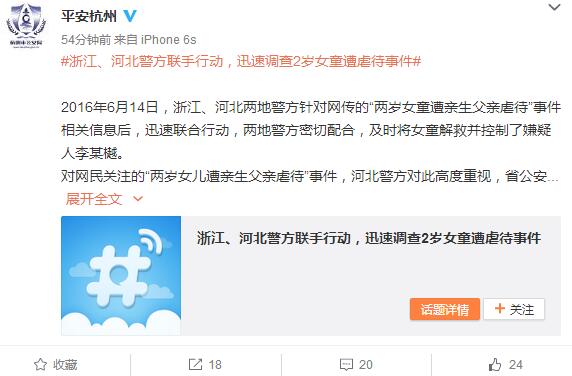 央廣網(wǎng)杭州6月16日消息(記者張國亮 李佳 河北臺記者白雪峰)據(jù)中國之聲《新聞縱橫》報道,孩子是父母的心頭肉,疼都來不及,然而,近日,一則“河北兩歲女童遭親生父親虐待”的消息,在微博平臺持續(xù)發(fā)酵。這條微博稱“親生父親揚言要打死女兒”,還附上了4張被打女童的照片,孩子身上多處布滿了淤青和血跡。發(fā)微博的人正是孩子的母親。14日下午,在河北、浙江兩地警方共同努力下,女童父親在杭州被警方控制。