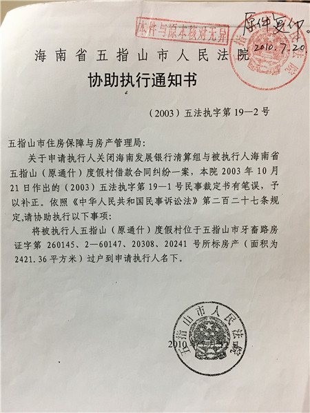 北京籍商人王鳳和在海南做房地產(chǎn)生意已有十四五個(gè)年頭。2010年,他通過報(bào)紙上拍賣公告,競拍了五指山度假村(原通什度假村)兩棟房產(chǎn):“因?yàn)榉孔又饕顷P(guān)閉海南發(fā)展銀行清算組的房,都是銀行處理的資產(chǎn),在拍賣現(xiàn)場我出價(jià)最高。當(dāng)時(shí)覺得這個(gè)價(jià)格比較合理,我就買下來了!