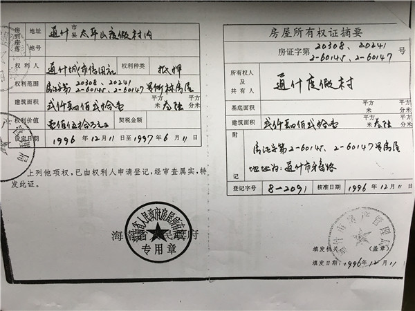 1996年12月11號(hào),由五指山房管局頒發(fā)的他項(xiàng)權(quán)利證,其中“房證字第20308、20241號(hào)”,正是237.9平米的大會(huì)議室與322平米的洗衣房。