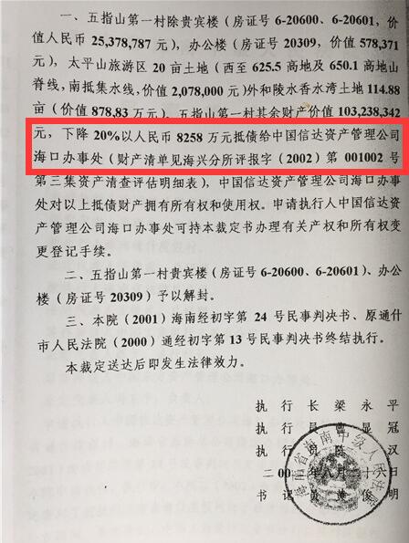 同一處房產(chǎn)出現(xiàn)兩本房產(chǎn)證,這讓王鳳和覺得不可思議。后來,在與五指山市房管局交涉中,王鳳和了解到,五指山金手指房本,也是2007年拍賣得來,并且經(jīng)過海南省一中院2002年作出的生效裁定書認(rèn)定:“海南中院有個(gè)裁定書,上面裁給信達(dá)公司,信達(dá)公司委托拍賣給海南金手指!