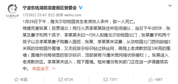 昨晚11點(diǎn)45分左右,動(dòng)物園所在地,寧波東錢湖旅游度假區(qū)管委會(huì)通過官方微博發(fā)布消息,確認(rèn)在雅戈?duì)杽?dòng)物園老虎傷人事件中死亡的男子姓張,籍貫湖北人;貞(yīng)中說,當(dāng)天下午2點(diǎn)左右,張某及妻子和兩個(gè)孩子、李某某夫婦一行6人到雅戈?duì)杽?dòng)物園北門,張某妻子和兩個(gè)孩子以及李某某妻子購票入園后,張某、李某某沒有買票,而是從動(dòng)物園北門西側(cè)翻越3米高的動(dòng)物園外圍墻,鉆過鐵絲網(wǎng),再爬上老虎散放區(qū)3米高的圍墻,圍墻外側(cè)有明顯的警示標(biāo)識(shí),頂部裝有70厘米寬的網(wǎng)格狀鐵柵欄。張某進(jìn)入老虎散放區(qū),李某某未進(jìn)入。相關(guān)情況有關(guān)部門正在進(jìn)一步調(diào)查核實(shí)。