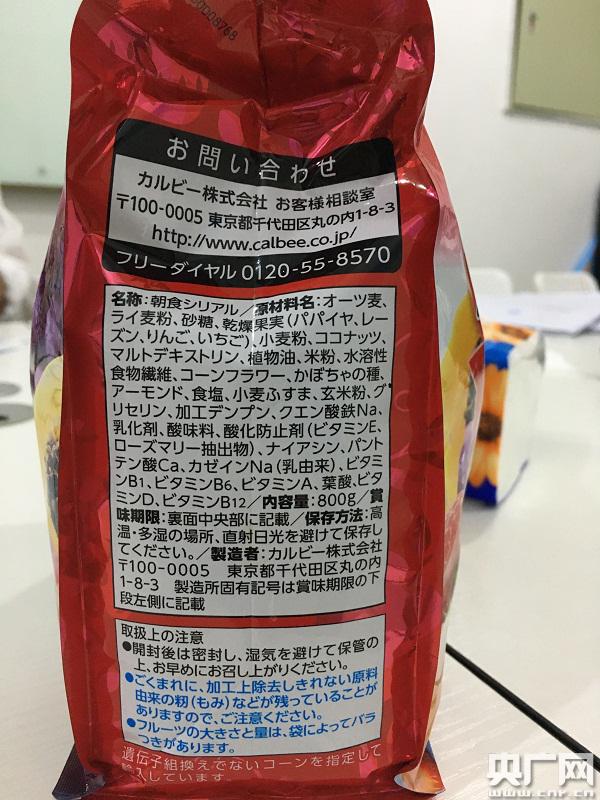 卡樂比麥片,包裝注明產(chǎn)地為東京都,包裝袋正面生產(chǎn)工廠為栃木縣。