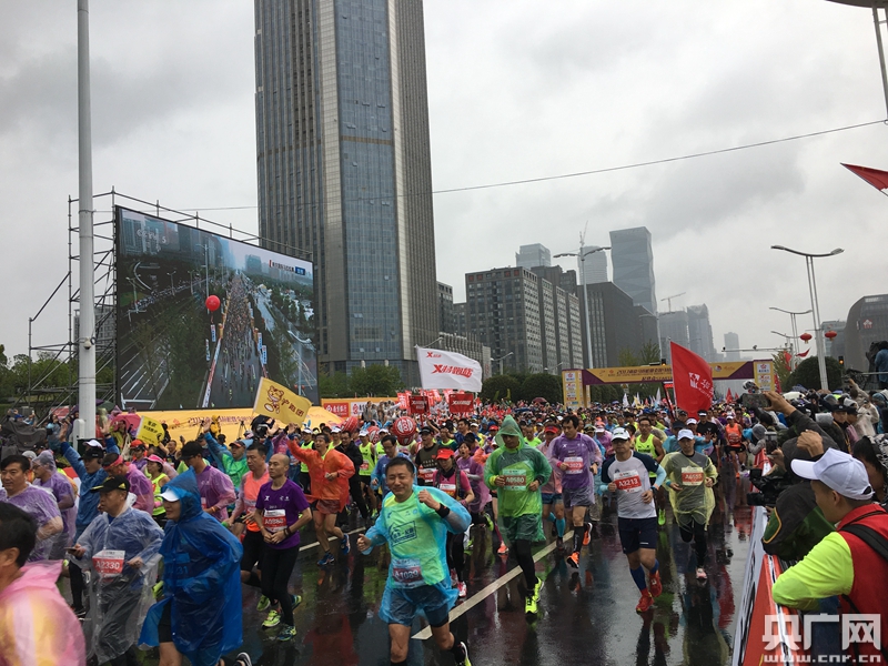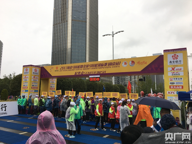 南京氣象臺(tái)預(yù)報(bào),今天全天陰有陣雨,東北風(fēng)4到5級(jí)。2.8萬名報(bào)名選手已經(jīng)集結(jié)完畢,正在開跑,有的選手準(zhǔn)備了薄薄的一次性雨衣,有的為不增加阻力,冒雨參賽。目前雨量不大,記者從現(xiàn)場了解,線路正常,沒有因?yàn)榉e水而影響賽道和線路。