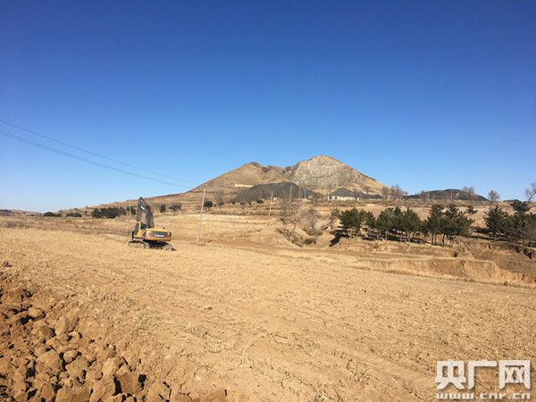 通遼市奈曼旗土城子鄉(xiāng)平頂山村,大型機(jī)械正在平整土地。徐秀春拿著鐵锨,把挖掘機(jī)壓過的硬塊鏟平。