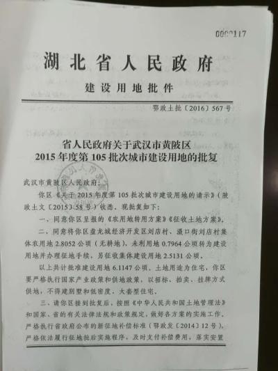 記者調(diào)查發(fā)現(xiàn),雖然案涉地塊2016才被湖北省政府批復(fù),由農(nóng)用地變更土地性質(zhì)為建設(shè)用地,但早在2002年,當(dāng)?shù)卣蛯⑦@塊土地交由武漢六建開發(fā),并讓武漢六建完成了“三通一平”(指基本建設(shè)項(xiàng)目開工的前提條件)和繳納了征地補(bǔ)償費(fèi)用。盤龍城經(jīng)開區(qū)管委會(huì)副主任胡莉萍解釋稱,當(dāng)時(shí)他們?cè)诼男羞@個(gè)協(xié)議,里面涉及到征地這一塊的工作,要與農(nóng)民對(duì)接,他們協(xié)助他做相關(guān)的工作。按照國(guó)家的相關(guān)政策,土地是要進(jìn)行補(bǔ)償?shù)摹?/p>