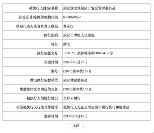 湖北省委巡視組已經(jīng)介入此案的執(zhí)行。2017年7月12日,武漢市中院就將盤龍城經(jīng)開區(qū)管委會(huì)和其法人代表曹家漢列入失信被執(zhí)行人名單。武漢市中院方面表示,不排除刑拘曹家漢的可能。一位法律界人士指出,法院仍有限制被執(zhí)行人高消費(fèi)、拘留法定代表人和直接責(zé)任人,以及按照拒不執(zhí)行法院判決裁定罪問責(zé)等強(qiáng)制措施沒有實(shí)施。