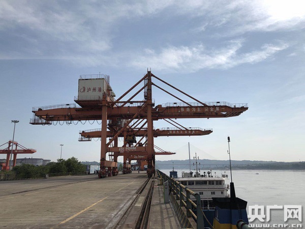 在瀘州港國際集裝箱碼頭,瀘州市交通運輸局局長沈昭平說,這里是一個川渝滇黔的集合部,另外也是四川的第一大港!叭ツ晡覀兪俏迨f集裝箱,今年我們的目標是六十萬(集裝箱)。”