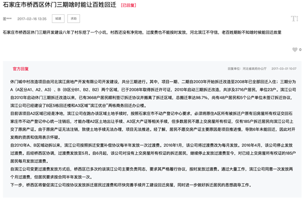 被拆遷居民多次到相關(guān)部門反映問題,2017年曾在相關(guān)政務網(wǎng)站上留言,河北省政府辦公廳回復稱,橋西區(qū)將督促濱江公司按協(xié)議發(fā)放過渡費和盡快完善手續(xù)開工建設。(網(wǎng)頁截圖)