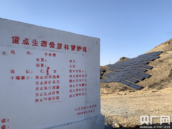 在阜新蒙古族自治縣化石戈鄉(xiāng)西二色村附近,記者看到,2018年6月8日剛立起來(lái)的“重點(diǎn)生態(tài)公益林管護(hù)區(qū)”公示牌背后,不是大片的林地,而是黑壓壓的光伏面板,光伏板下一個(gè)個(gè)的樹(shù)坑仿佛告訴著人們,這里本該是一片林地。