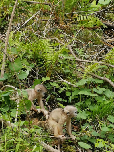 風(fēng)聲、鳥(niǎo)聲、樹(shù)葉聲,夾雜著短促的嘶鳴。獨(dú)屬于山間的精靈忽然跳入眼簾,雄猴頂著一頭金紅的披肩、灰藍(lán)色的臉孔,威風(fēng)凜凜地在林間騰躍,剛剛出生的小猴則害羞地往猴媽媽?xiě)牙镢@。一只渾身淺金色絨毛的小猴拉扯著我的鞋帶,忽閃著清澈的大眼睛定定地看著我。