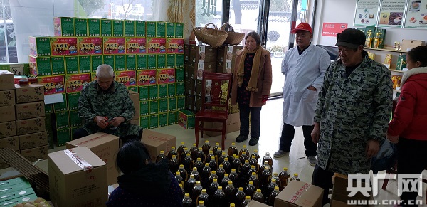 楊長太和貧困戶一起把農(nóng)副產(chǎn)品打包發(fā)貨(中央廣播電視總臺央廣記者 胡曉輝 攝)