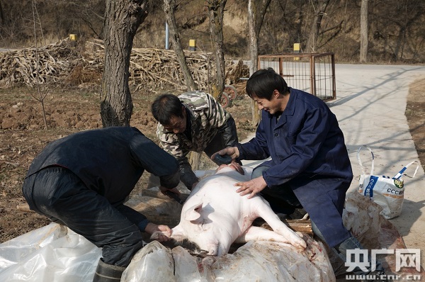 燙豬、刮毛……各項工序按慣例依次完成。收拾了這頭年豬,楊軍軍一家能過個“肥年”,去年,他養(yǎng)豬收入近十萬元。殺豬的動靜引來了不少鄉(xiāng)鄰,他們紛紛圍著楊軍軍“拉呱”起來。