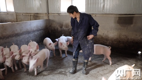 楊軍軍一入豬圈,豬仔們都湊過來(中央廣播電視總臺央廣記者 王妍 攝)