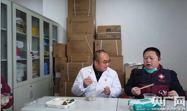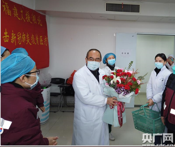 金銀潭醫(yī)院院長張定宇帶著鮮花和湯圓慰問福建醫(yī)療隊(中央廣播電視總臺央廣記者 李行健 攝)