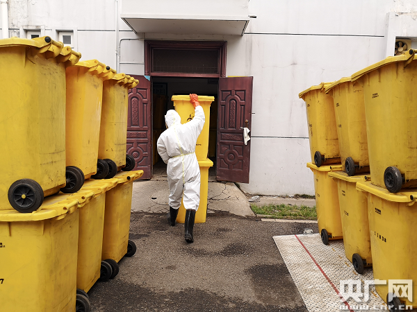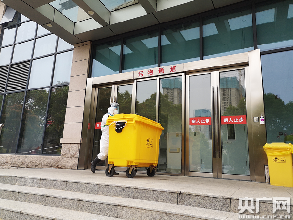 金銀潭醫(yī)院的保潔人員將污染區(qū)內(nèi)的醫(yī)廢及時(shí)轉(zhuǎn)運(yùn)至醫(yī)院的暫存間(中央廣播電視總臺(tái)央廣記者 肖源 攝)