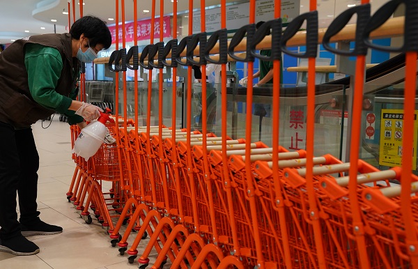 超市保潔員為兒童用購(gòu)物車(chē)消毒(央廣網(wǎng)發(fā) 豐臺(tái)區(qū)委宣傳部供圖)