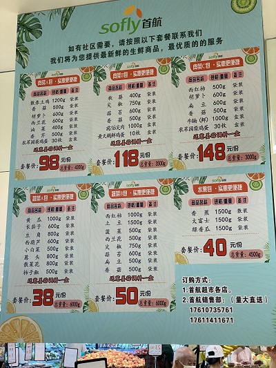 除了門(mén)店經(jīng)營(yíng)之外,首航超市還面向封控小區(qū)、單位食堂等特殊場(chǎng)所推出了“蔬菜包、肉菜包、水果包”。李榮華說(shuō),僅七里莊門(mén)店每天就提供1000包肉、菜、水果,“因?yàn)殡S著疫情的發(fā)展,有一部分中高風(fēng)險(xiǎn)地區(qū)小區(qū)的居民購(gòu)物可能不是特別方便,另外一些單位的食堂也有需求。我們的價(jià)格也比較低,目前我們這里對(duì)六七個(gè)小區(qū)、10多家單位食堂大概每天提供將近1000包‘蔬菜包’!