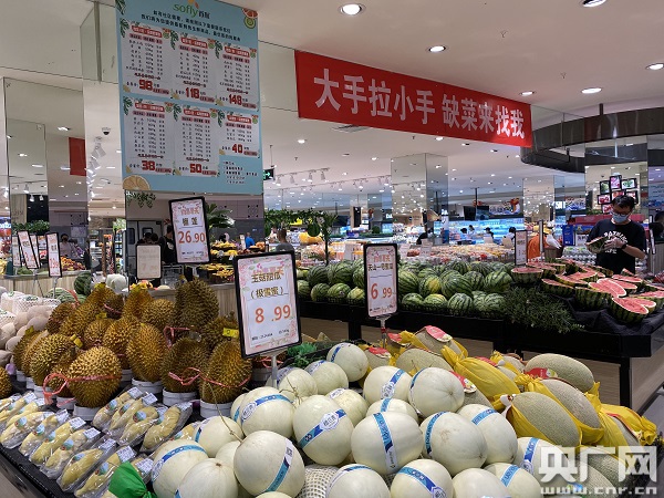 首航超市七里莊店,菜肉水果供應(yīng)充足、價(jià)格適中(中央廣播電視總臺(tái)央廣記者 肖源 攝)